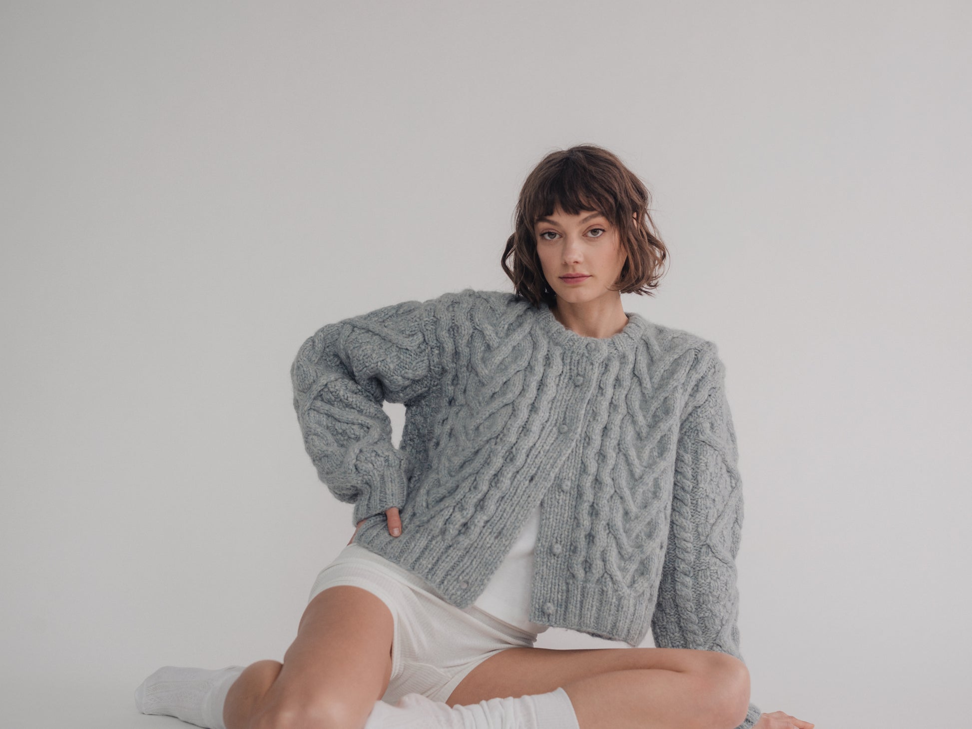Knit from the softest alpaca and cotton, the Yaga Day Cardigan feels both new and nostalgic. Features heritage cable stitches and yarn covered buttons.